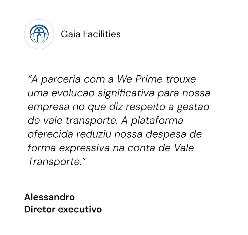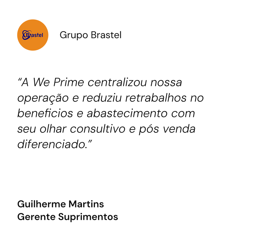 We Prime conecta sua empresa aos principais players do mercado e entrega soluções customizadas em vale-alimentação, VT, abastecimento e frota e soluções financeiras com adequação à NR-01 e sem custo direto ao empresário.